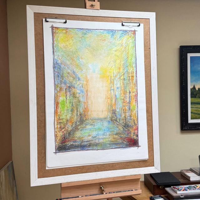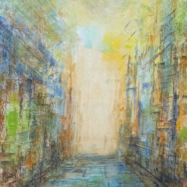 This pastel drawing radiates from a luminous centre, a gentle light that represents the core of our being. From this still point, waves of colour emanate outward, merging and transforming as they move through the paper. The movement of pigment and hue expresses the unfolding of love, consciousness and energy as they manifest in our physical world.