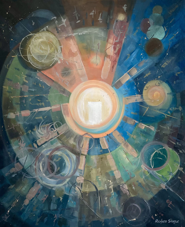 The painting shows purity of colour at the centre of the painting, depicting the here and now. As the colours expand, they offer their own journey through the known and unknown. Shapes and forms offer insights into existences outside our world.